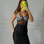 Questo abito aderente è perfetto per un look audace e scintillante. Il corpetto trasparente con dettagli luminosi applicati valorizza il décolleté, mentre la gonna fasciante a vita alta esalta le curve con eleganza. Ideale per serate speciali o eventi in cui vuoi essere protagonista e brillare ad ogni passo