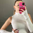 Un modello fresco e versatile, perfetto per creare look moderni e grintosi. Questa maglia cropped senza maniche si caratterizza per il collo alto a costine e per i mezzi guanti coordinati, che aggiungono un tocco originale e di tendenza. La vestibilità aderente valorizza la silhouette, rendendola ideale per abbinamenti con pantaloni a vita alta o gonne.