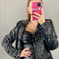 Una giacca grintosa e super glam ✨. Realizzata in ecopelle, è interamente decorata con borchie e applicazioni luminose che regalano al look un’attitudine rock e brillante. La chiusura con zip e il taglio strutturato aggiungono un tocco deciso, perfetto per chi vuole distinguersi con carattere 💘.