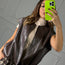 Questo gilet senza maniche in ecopelle è perfetto per dare un tocco grintoso e moderno ai tuoi outfit. Il taglio dritto con cordoncino regolabile sul fondo permette di adattarne la vestibilità, mentre il finish lucido dona un effetto elegante e audace. Ideale da indossare sopra camicie, maglie o abiti per look decisi e originali 🖤